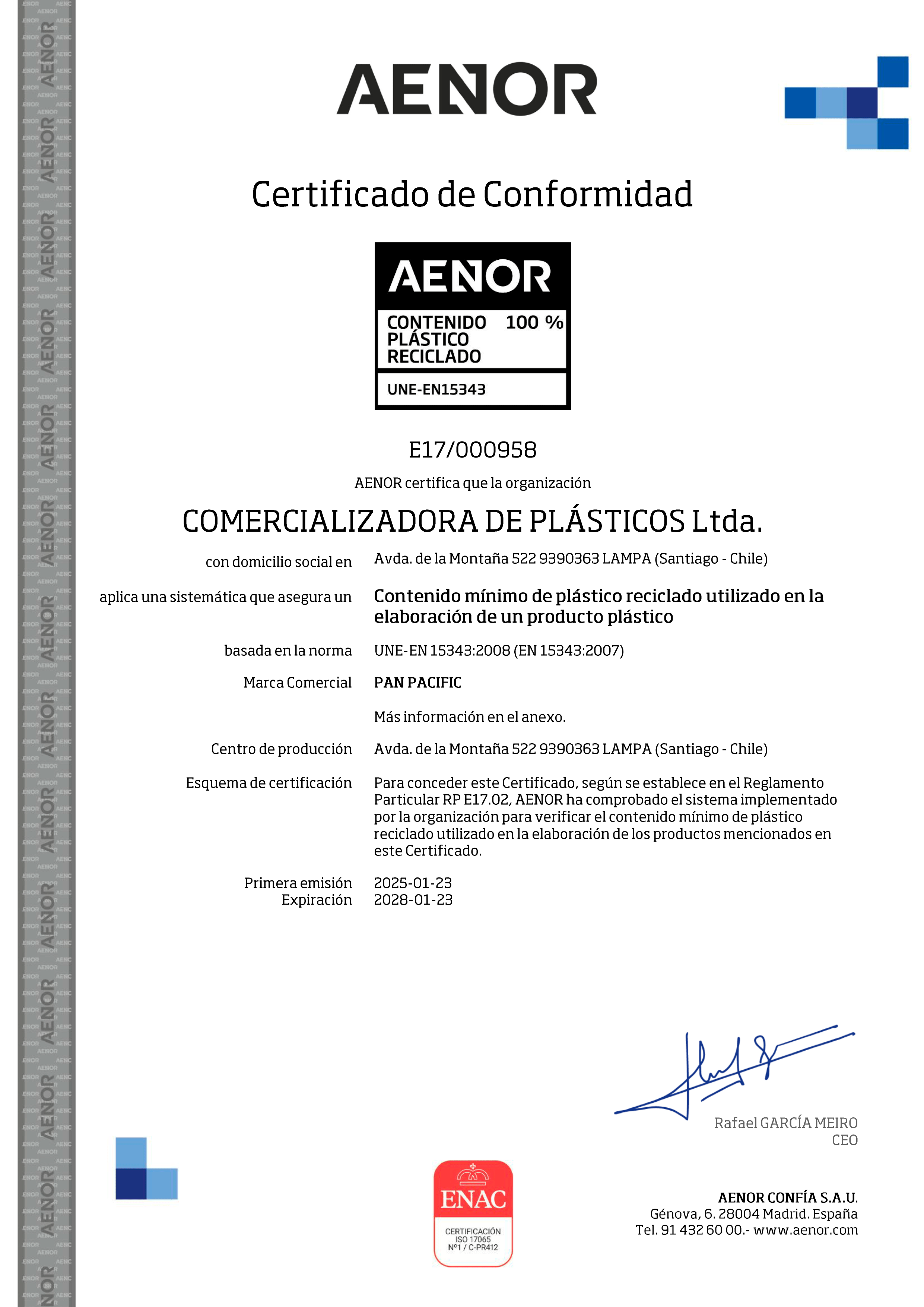 La Certificación AENOR garantiza que el 100% del material utilizado en la fabricación de nuestros productos (Clamshells de: Uva, Cereza, Mora y Arándano), proviene de plástico reciclado. Esta Certificación fortalece nuestro compromiso de entregarles a nuestros clientes productos de la más alta calidad, y amigables con el medioambiente.