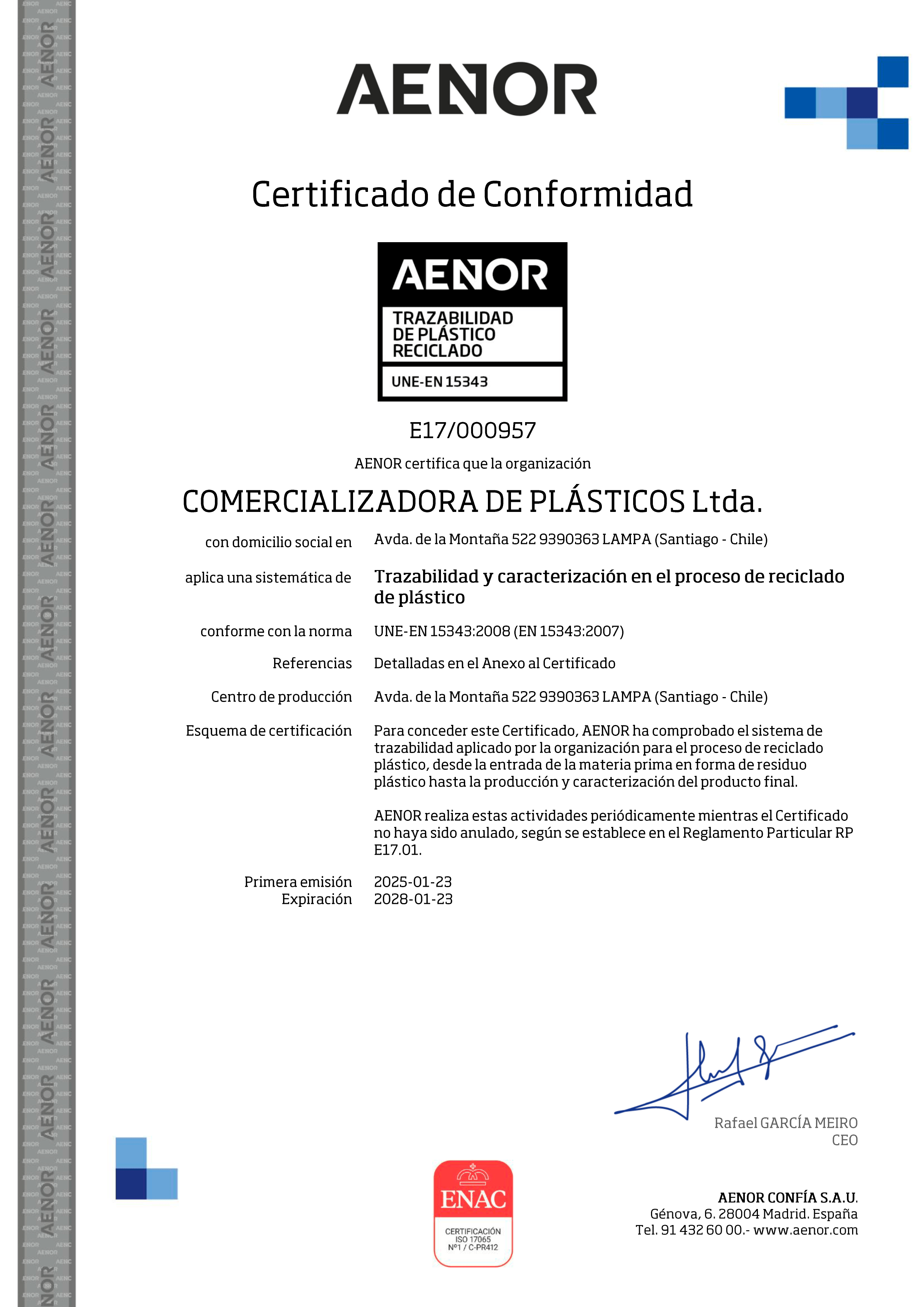 La Certificación AENOR ha comprobado el sistema de trazabilidad aplicado por nuestra Compañía, para el proceso de reciclado plástico, desde la entrada de la Materia Prima en forma de residuo plástico hasta la producción y caracterización del producto final.